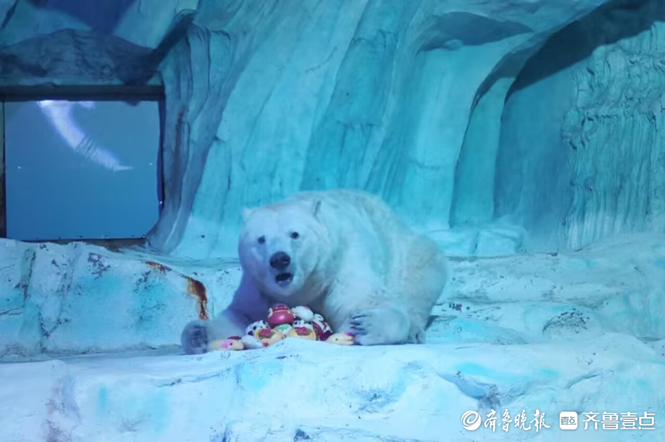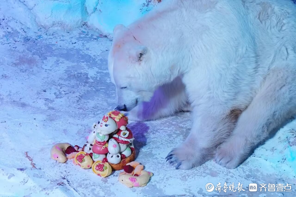 新春来临之际,1月18日,青岛极地海洋公园的北极熊也吃上了定制版新春大餐“胶东花饽饽”,欢庆“海洋”新年。