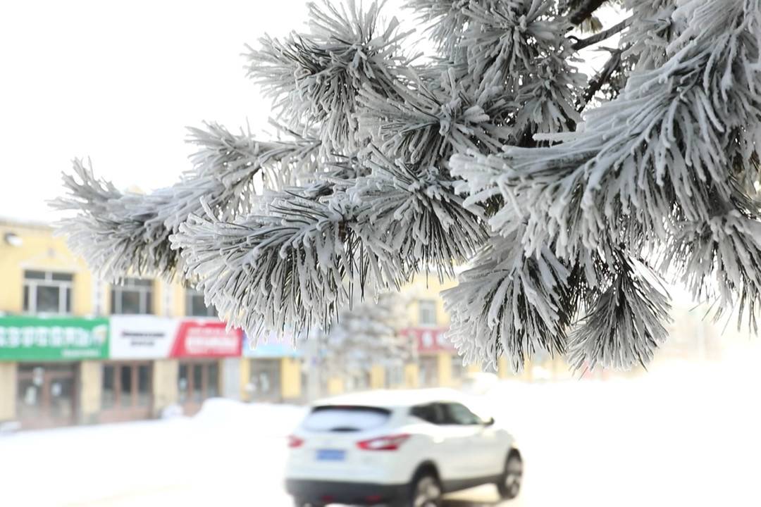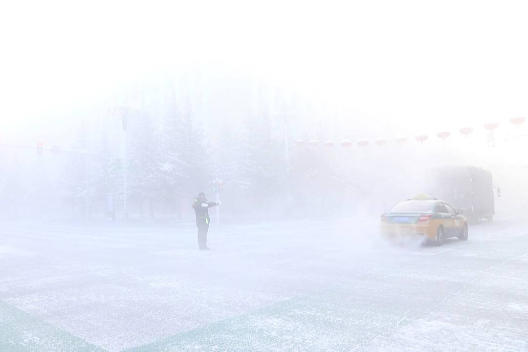 “最近几天冰雾特别大,现在的能见度不足50米,我们七点就上岗了,提醒广大驾驶员打开雾灯减速慢行。穿得特别厚,穿了两层羽绒服、戴了两副手套,脚底下贴了两个热贴。”漠河交警李才伟说。