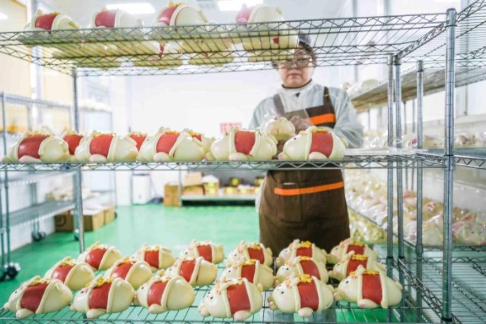 1月18日,在威海市市级非物质文化遗产“吉昌”花饽饽第五代传人孙海燕的磨爱麦花饽饽工坊。几名面点技师围坐在案板前制作兔年花饽饽——“醒狮兔”,她们每人不同分工,最后要把几十个的“零件”组装起来,才能做成这款惟妙惟肖的醒狮兔。