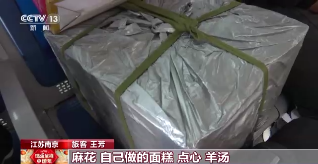 旅客王芳:麻花,自己做的面糕、点心、羊肉汤。她嫁到那边好久没有回家了,让她尝一尝家乡的味道,家人特别想她。