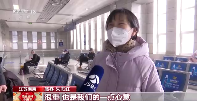 来南京转车的朱志红常年在沈阳打工,每逢春节都会回扬州老家与亲人相聚。今年,她和丈夫给家人背回了一整只羊。