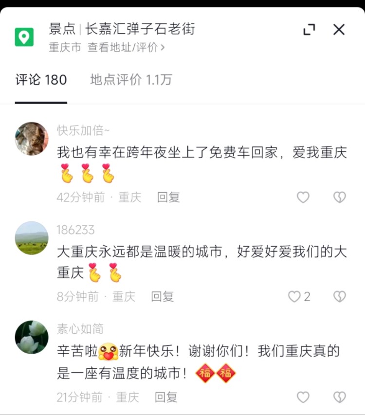 多位网友回复点赞大重庆的“温度”:“重庆从来都是一座有温度的城市,人情味体现在各种细节上”“只有这样才能安全把你们带回家”“大重庆威武霸气”“我心目中温暖城市,最强是重庆”“好爱好爱我们的大重庆”。