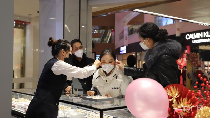 前来选购金饰的顾客夏彩雨说:“新年了,也发了年终奖,今天带爸爸妈妈来买点金饰,辛苦了一年了,也给自己选一件,这里的兔子金饰都很精致。”