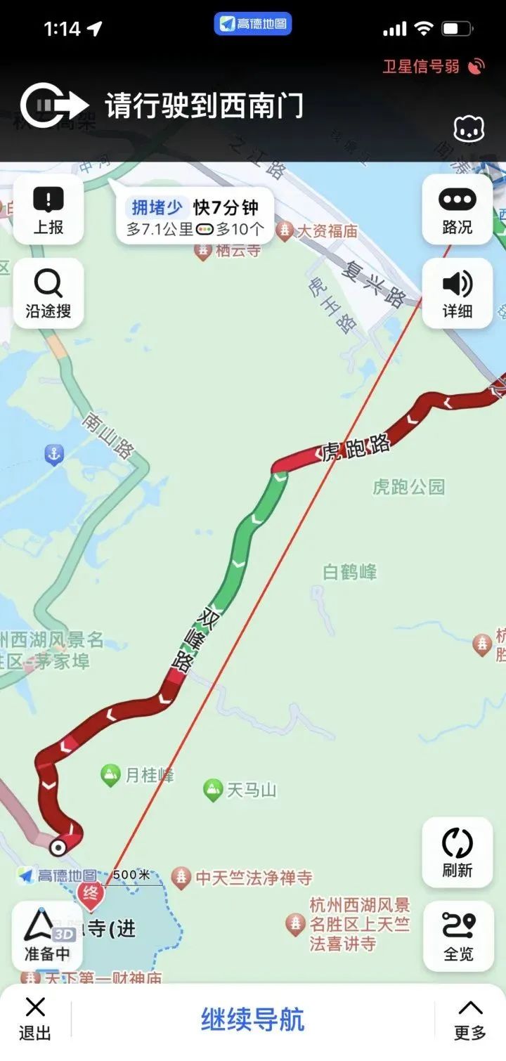 下午1点多,记者打开手机导航软件发现,去灵隐的虎跑路“大红大紫”。