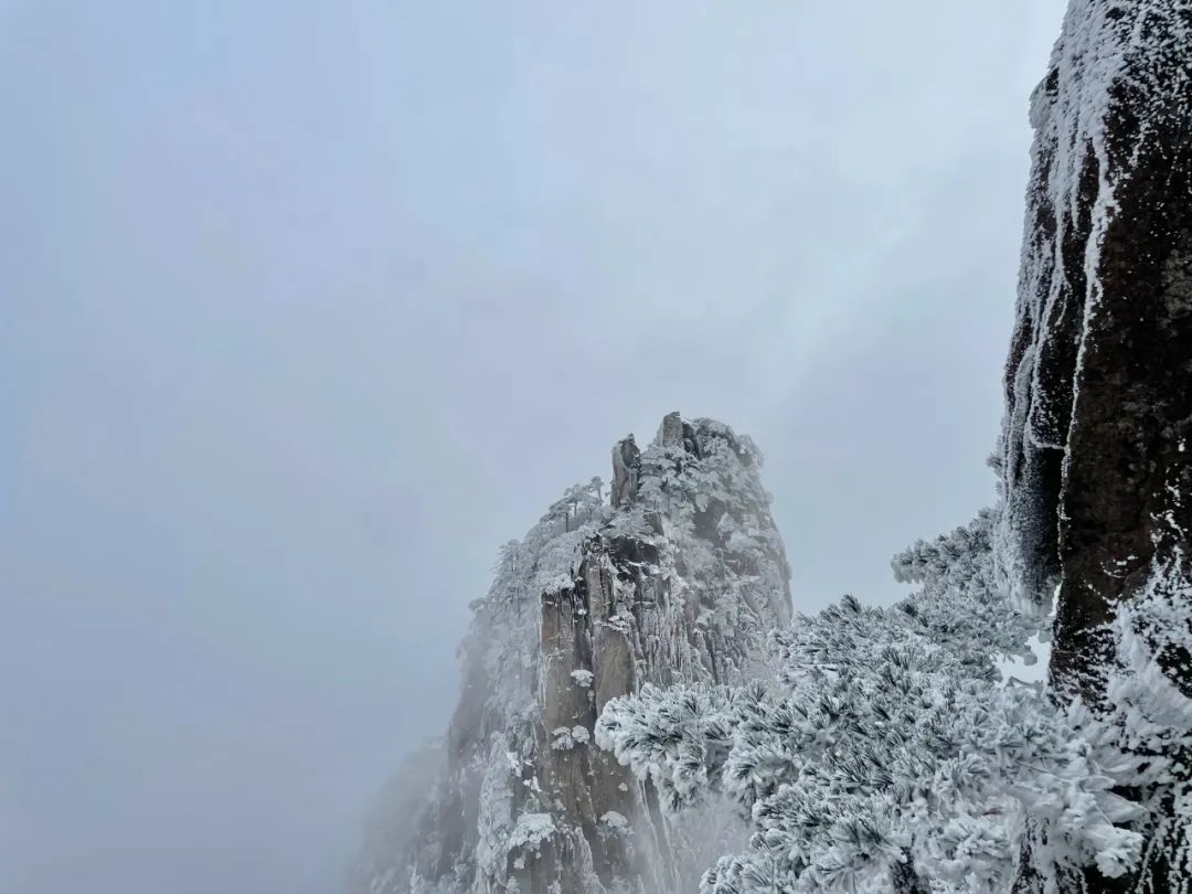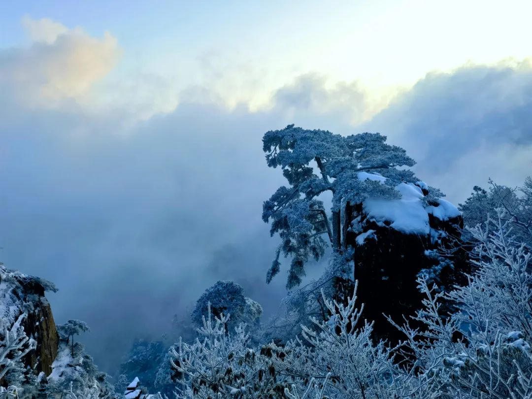 昨天的一场大雪,给五百里黄山披上了银色的盛装。远处,峰峦、沟壑都笼罩在白茫茫的大雾里,孤峰突出云层,如大海中矗立的岛屿。峰顶的松树盖满了雪花,就像给山峰戴上了一顶白色的帽子。