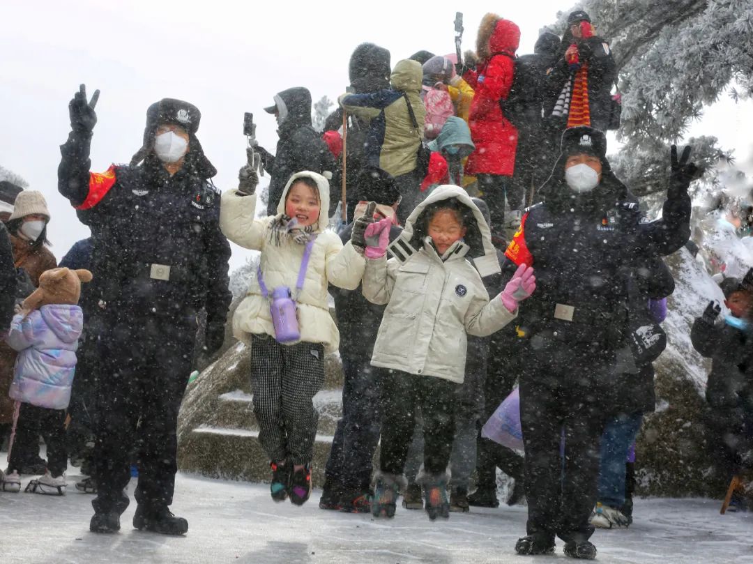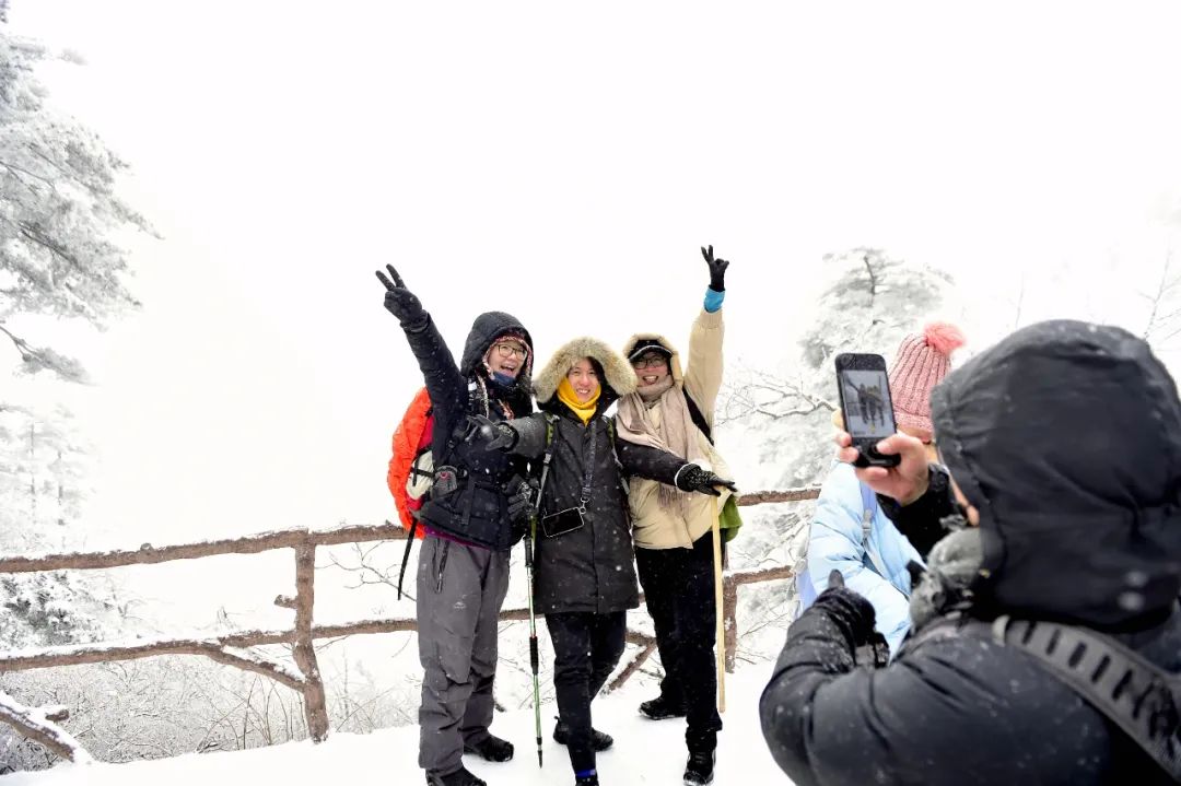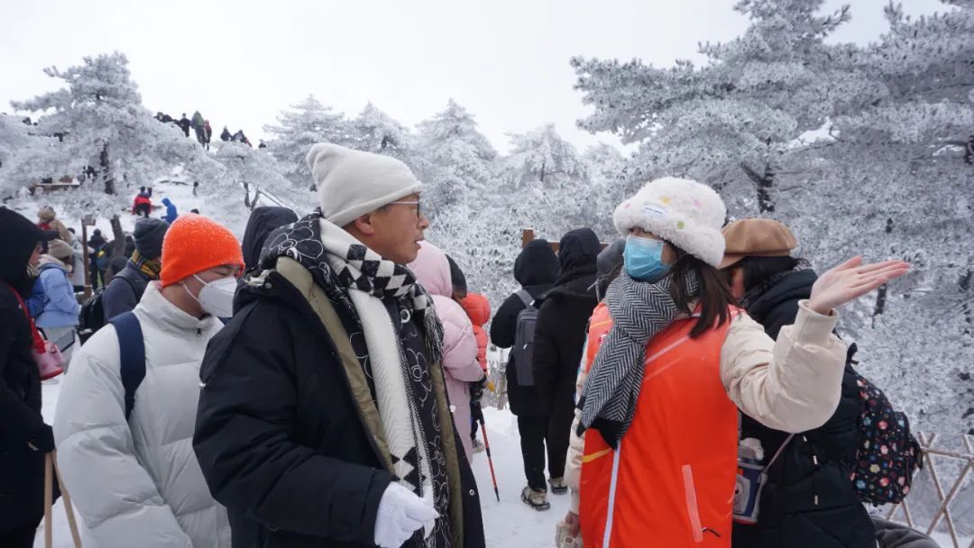 游步道旁、观景台边,游客们纷纷驻足拍照、合影留念,到处都是欢声笑语,洋溢着节日的喜庆气氛。上海游客郭女士站在凤仪松下,喜悦之情溢于言表,她说:“我们特意赶过来看这场大雪,看了以后,觉得非常漂亮,非常壮观。在南方很少能看到这么美的雪景,黄山的松、山、雪,层次很鲜明,构图很好看,非常有层次,这是很难见到的景观。”