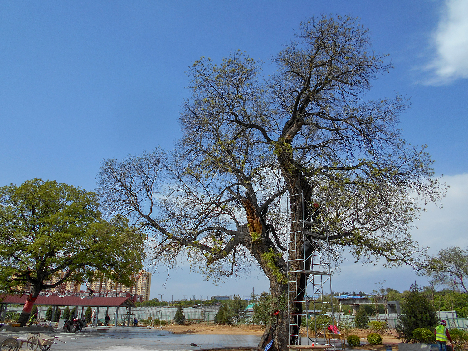 太原市进行第二轮古树名木资源普查时,发现这棵古槐树体有大量腐生树洞,导致树干中空、养分供应不足,相邻的一株树龄300年的古槐叶片已经郁郁葱葱,而这棵千年古槐却刚刚萌发——老树病了。