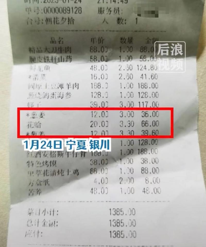 有网友反映,1月24日大年初三,他在银川约了朋友到一餐厅吃饭,当晚喝了点酒,结完账就走了,单次日看结账单感觉不太对劲,小票上的收费项目还包含“葱姜”。据其小票显示,其点的蛏子39元一斤,3斤117元,葱姜费单价12元,数量也是3,蛏子的葱姜费就是36元,都快赶上一斤蛏子的价格,而花蛤是一斤20元,3.3斤66元,单花蛤的葱姜费总共是39.6元,都快赶上两斤花蛤的价格了。对此,该网友咨询餐厅前台被告知确实要收这个费用。该网友表示,自己从来没遇见这样的情况。