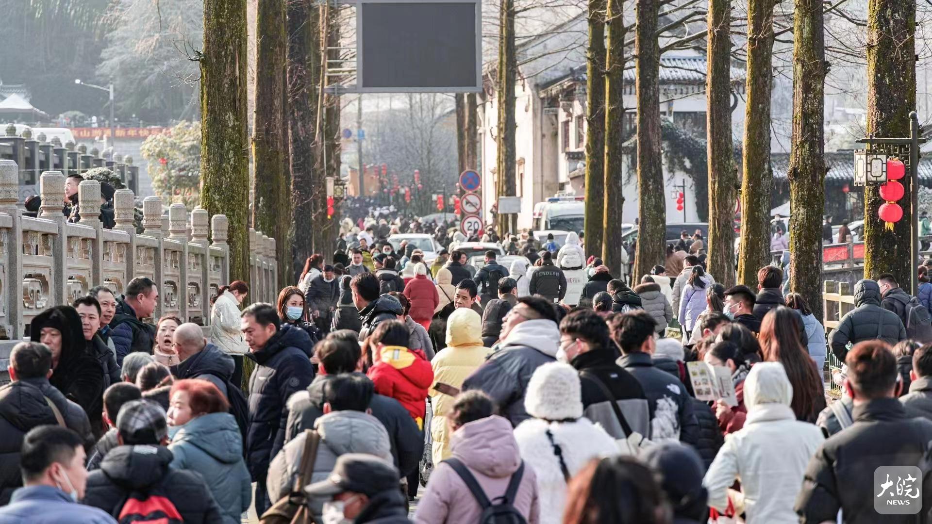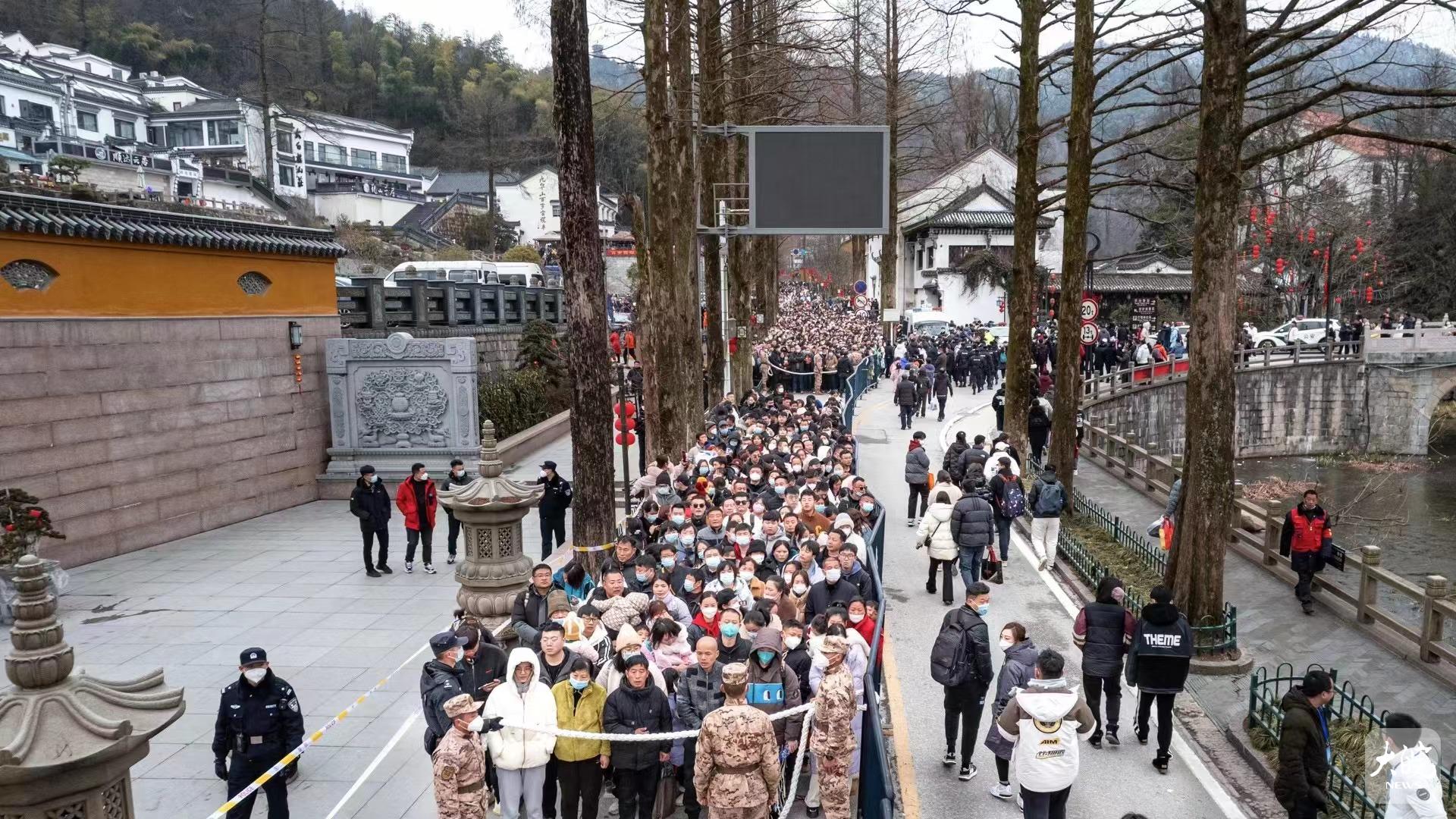 据介绍,今年春节期间,九华山风景区全面实施交通管制和“多点分流”等措施,所有来山游客车辆均停放在山下停车场,景区设立了3处车辆换乘点,方便游客停车后就近换乘,快速进入景区游览。大年初一当天,尽管下着小雨,九华山景区即迎来首波客流高峰,全天接待游客4.05万人次,同比增长164%。大年初二,九华山飘起了农历兔年的第一场雪花,这也给春节期间的九华山带来了别样的年味,各地游客们纷至沓来。