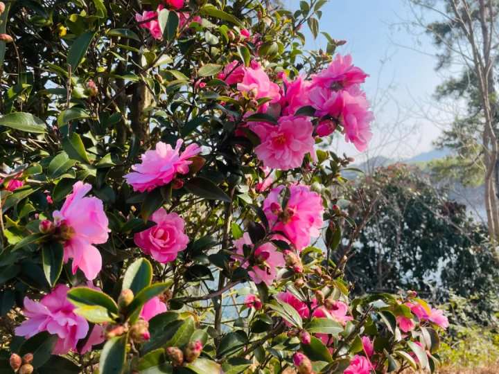 千岛湖植物园位于千岛湖中心湖区的清心岛,隆冬的清心岛众芳摇落,茶梅却在此时绽放艳丽。它穿越凛冽的寒风,说是欺霜傲雪也不为过,茶梅花开,冬过,茶梅花落,春来。