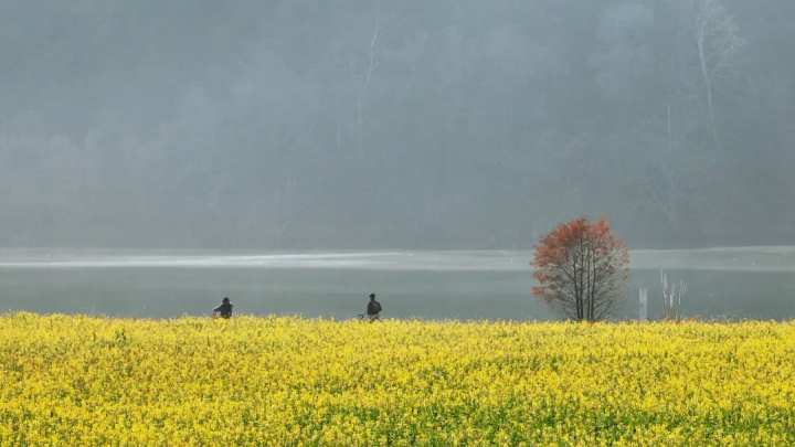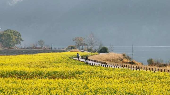 建德市下涯镇之江村黄饶半岛已是黄花满枝,300余亩“迎春一号”油菜花与青山、碧水、游客相映成趣,呈现一派田园早春的别样景致。