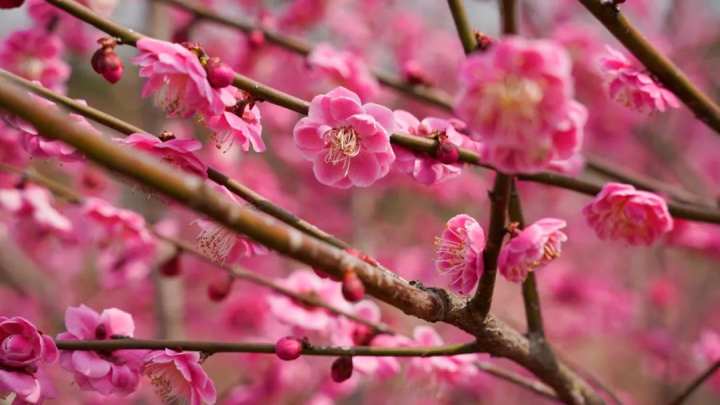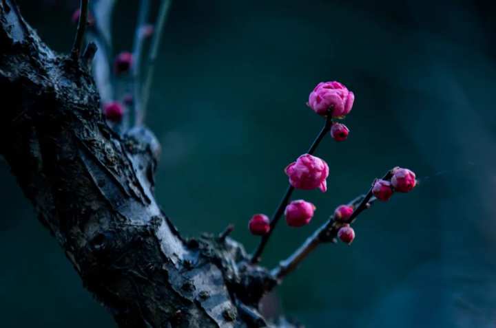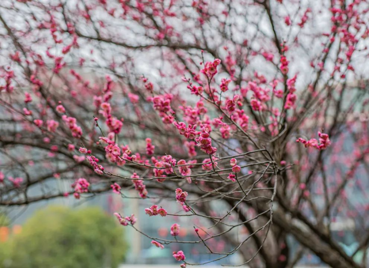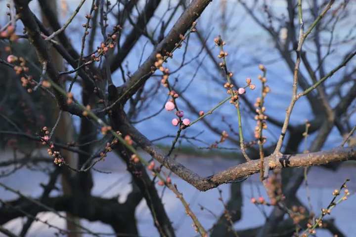 梅园里,株株梅树枝丫交错,花朵含苞,宛如星星点点的珍珠点缀。从树身的深棕到细枝的浅灰,再到小枝上的那一点艳色,仿佛逐渐晕开了水彩的画,浅淡的红色不显突兀,逐渐与深暗的色调水乳交融。