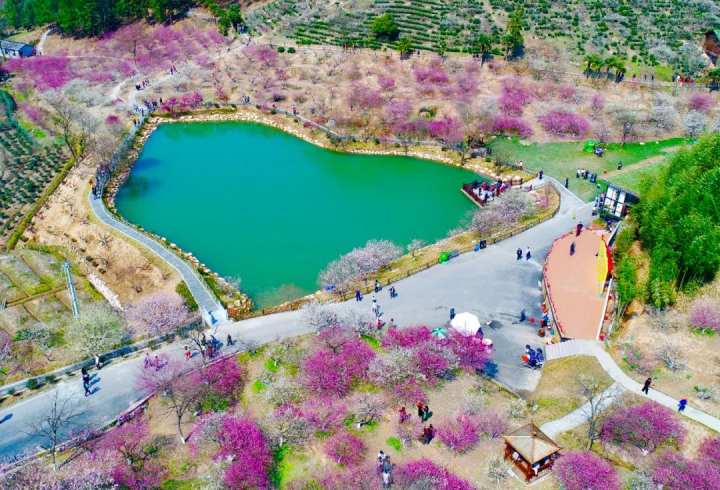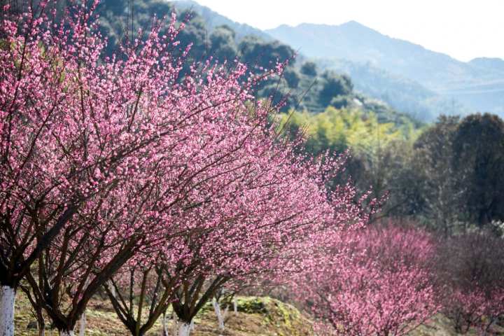 梅园占地面积300余亩,共有5000多株梅树,树龄在三四十年以上的有一千多棵,涵盖了十几个品种,包括朱砂、宫粉、绿萼等与浙江农林大学合作开发的稀有品种。梅花绽放时,漫山姹紫嫣红的景象让人赏心悦目,流连忘返。