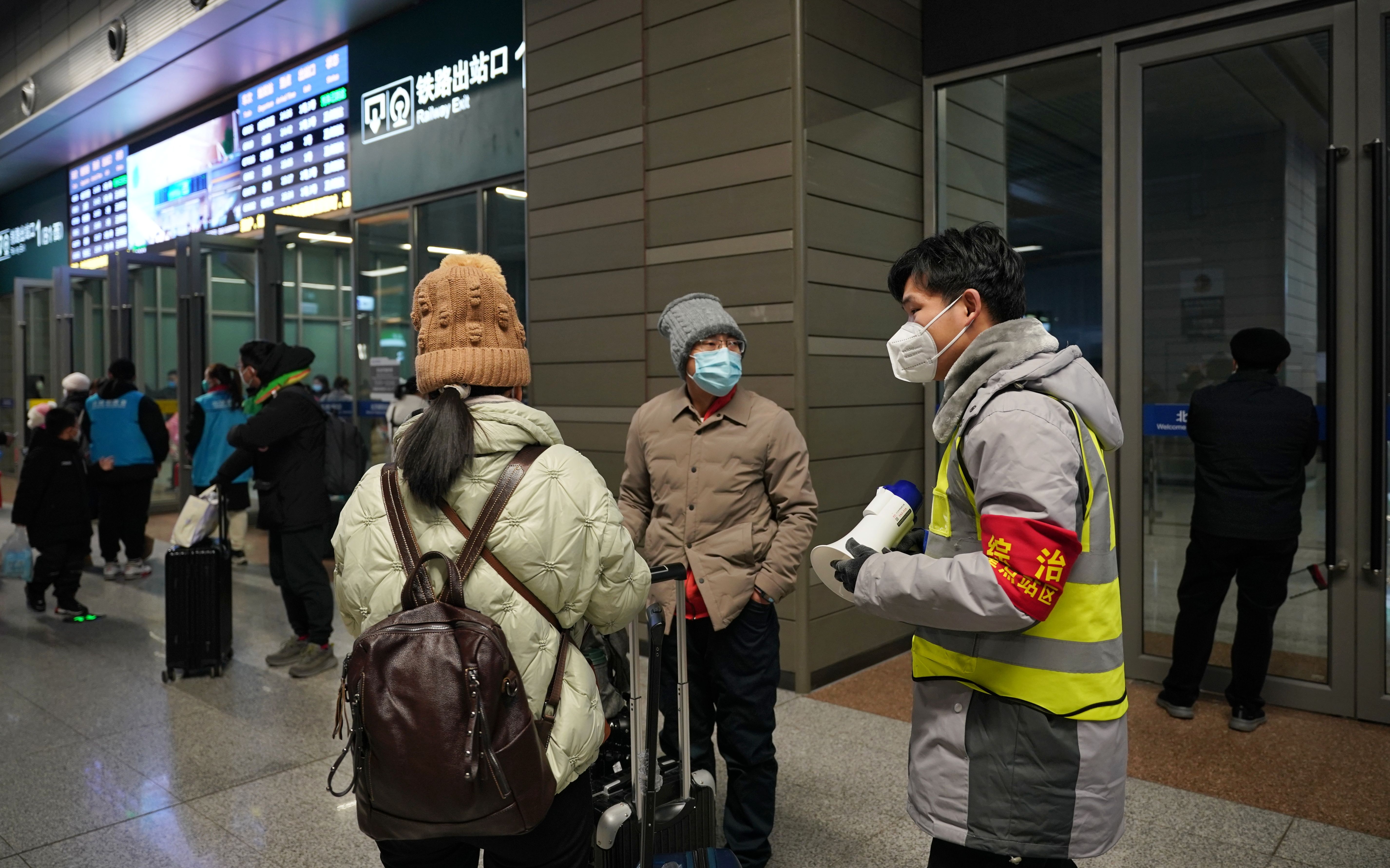 北京朝阳站出站口外,工作人员解答旅客的出行问询。新京报记者王贵彬摄
