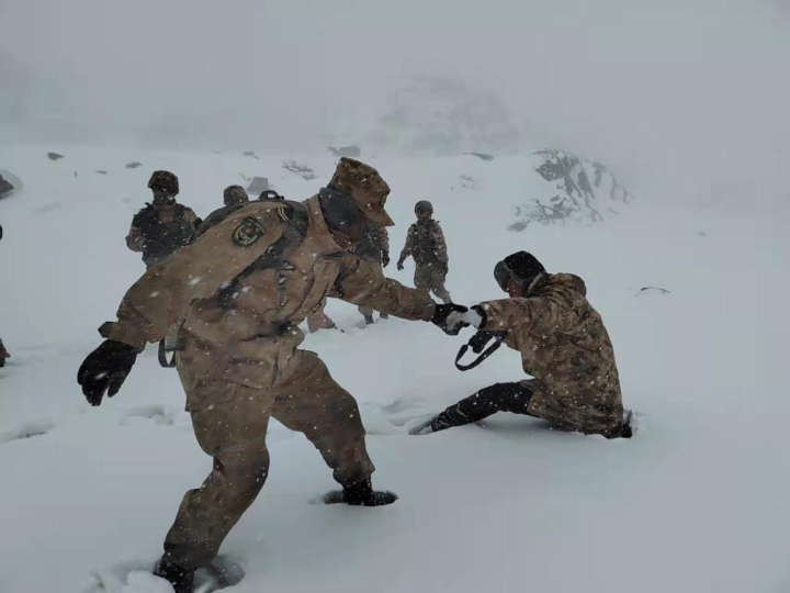 2022年“新春走基层”活动中,中央广播电视总台记者(右一)和官兵一同在海拔近5000米的边防线巡逻图源:新华社