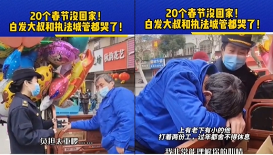 ·1月24日,湖北武汉一名城管队员劝离摆摊大叔,了解到白发大叔已经有20个春节没回家过年,打着两份工过年都舍不得休息。最后,两个人都哭了。