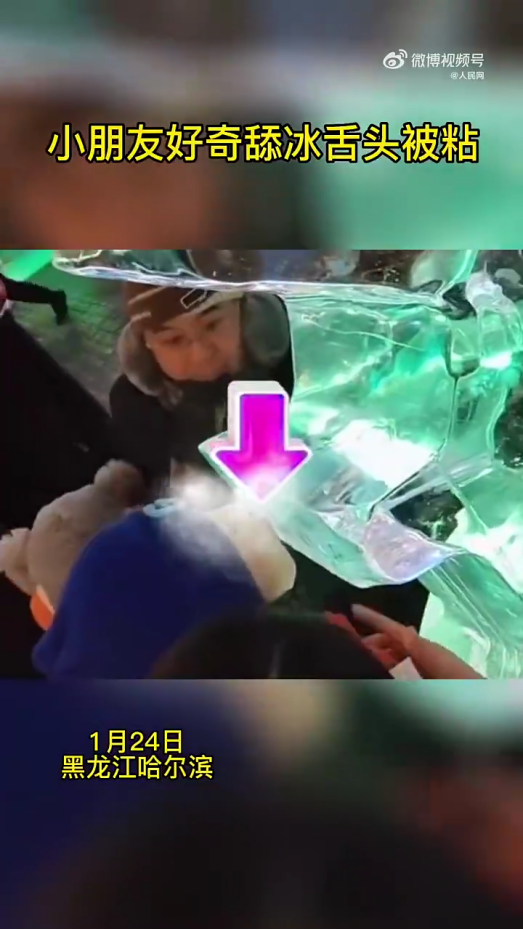 ·哈尔滨一小朋友因为好奇舔冰雕,舌头被粘住,路人用温水帮忙解冻。温馨提示:不要在东北冬天室外随意舔冰、舔铁栏杆。