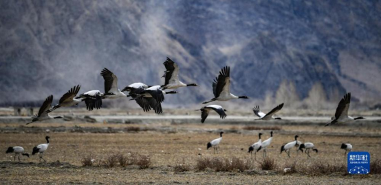 在西藏雅鲁藏布江中游河谷黑颈鹤国家级自然保护区日喀则片区拉孜县附近,大量越冬的黑颈鹤翩翩起舞,迎接春天的到来。