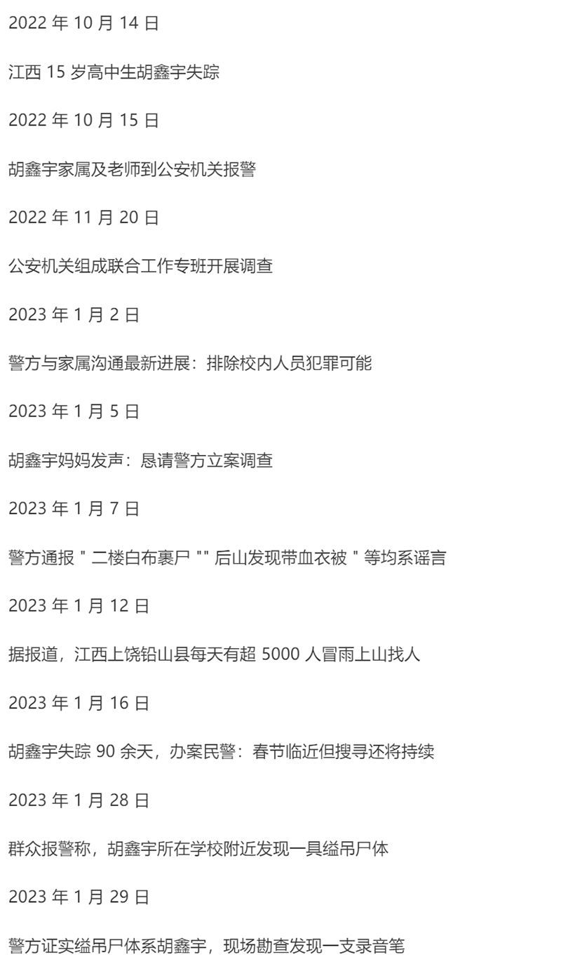 现代快报讯(记者刘遥)1月29上午,江西省、市、县公安机关联合工作专班发布警情通报,称在河口镇金鸡山区域树林中发现一具缢吊尸体,经DNA检验,确定死者系胡鑫宇。