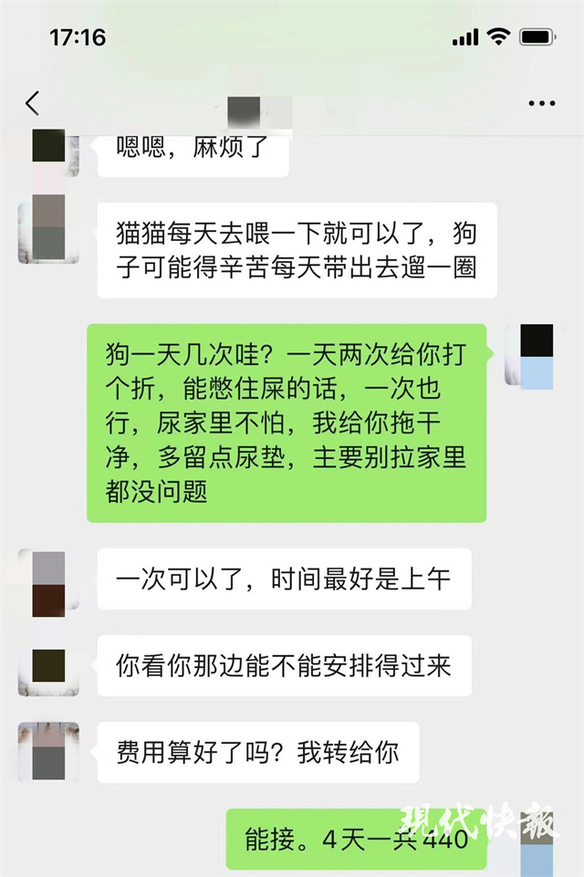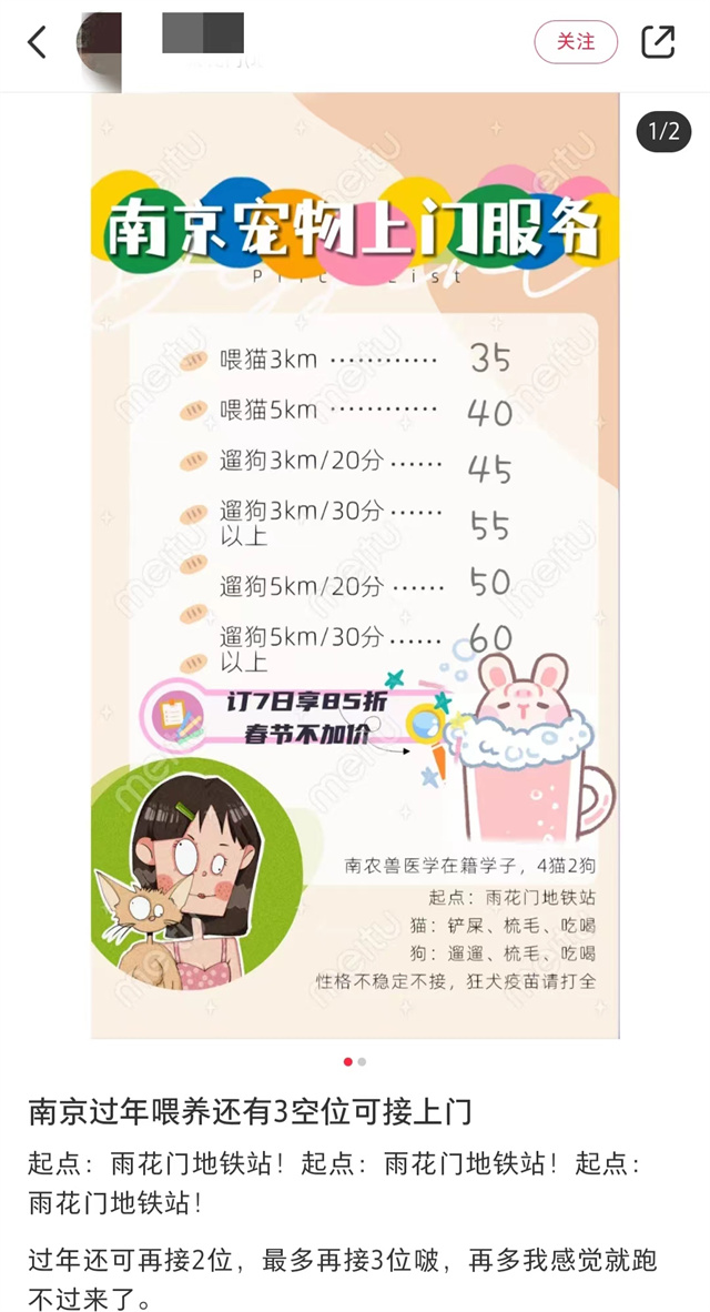 现代快报记者在各大社交平台搜索相关关键词,页面出现不少提供上门喂养留守宠物的信息,价格在35元—50元不等,此外根据上门的距离和宠物的数量价格会有所调整。在某种草平台,话题“春节上门代喂”阅读量有3.1万,一北京用户分享春节期间喂养宠物猫的经历。“春节期间认识了38只小猫咪,累计上门168次。”很多网友为她的服务次数点赞。