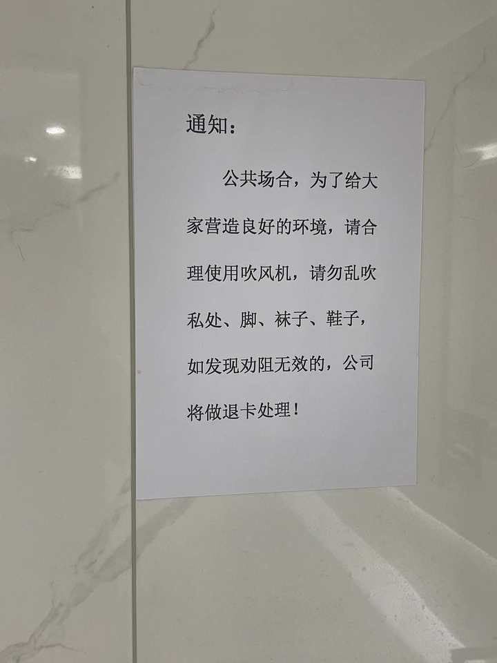 挥汗如雨之后,朱先生准备在卫生间里洗手,却惊讶地发现了一张通知:公众场合,为了给大家营造良好的环境,请合理使用吹风机,请勿乱吹私处、脚、袜子、鞋子,如发现劝阻无效的,公司将做退卡处理。