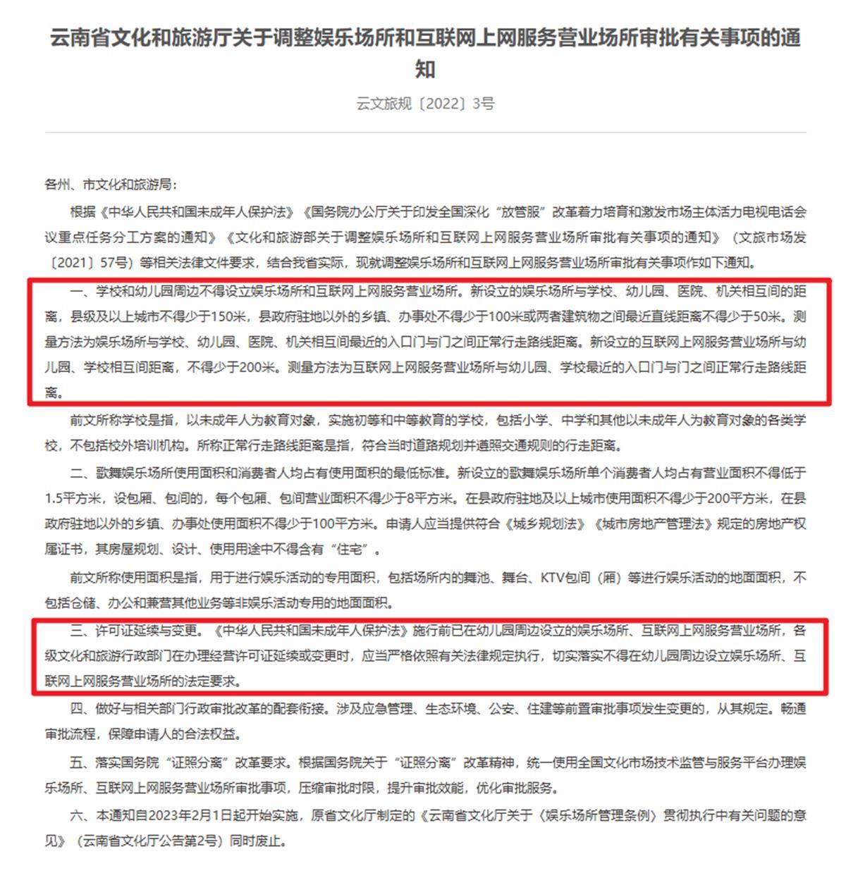 极目新闻记者了解到,上述消息来源于云南省文化和旅游厅2022年12月26日发布的《关于调整娱乐场所和互联网上网服务营业场所审批有关事项的通知》(下称“通知”)。