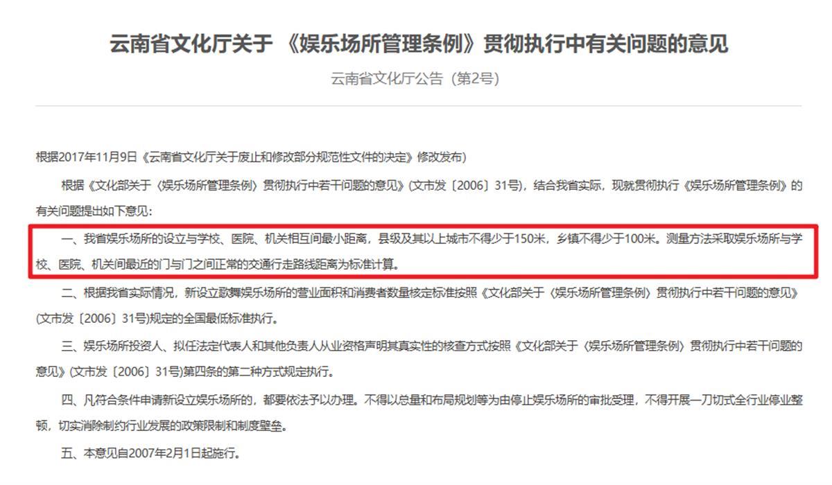 记者查询发现,原云南省文化厅制定的《云南省文化厅关于〈娱乐场所管理条例〉贯彻执行中有关问题的意见》就曾提到,该省娱乐场所的设立与学校、医院、机关相互间最小距离,县级及其以上城市不得少于150米,乡镇不得少于100米,上述意见自2007年2月1日起施行。但随着新的通知于2023年2月1日起开始实施,上述意见已被废止。