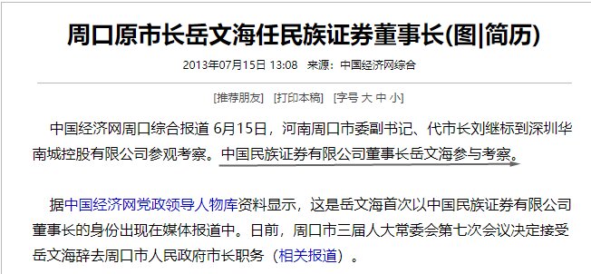 上述两则信息似乎告诉人们,辞去市长职务后,岳文海进入中国民族证券有限责任公司工作,职务是党委书记、董事长。那么,这些信息是真实的吗?