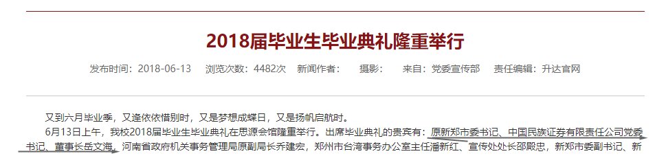 在“新县广播电视台”微信公众号上搜索“岳文海”会出现几十条报道,从2016年12月至2019年5月,基本都是民族证券与新县的扶贫工作报道。从这些报道画面中可以看出,民族证券的岳文海就是曾经的周口市市长岳文海。这些报道中可以看出,那两三年的时间,岳文海时常去河南新县。这些信息中关于岳文海职务的介绍只包括“党委书记”、“扶贫工作领导小组组长”,并无其他。