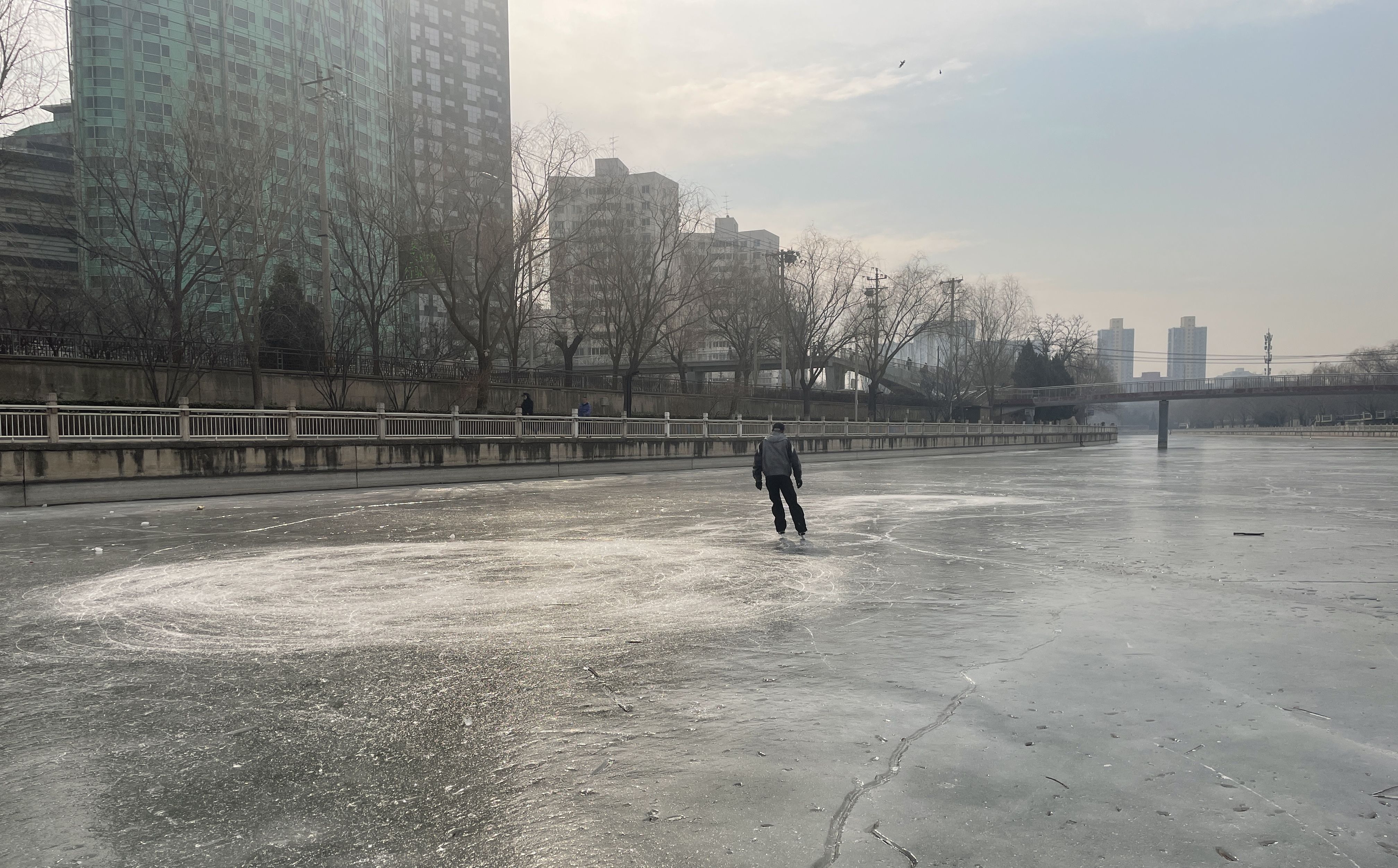 市民在南护城河冰面滑冰。新京报记者徐巧丽摄