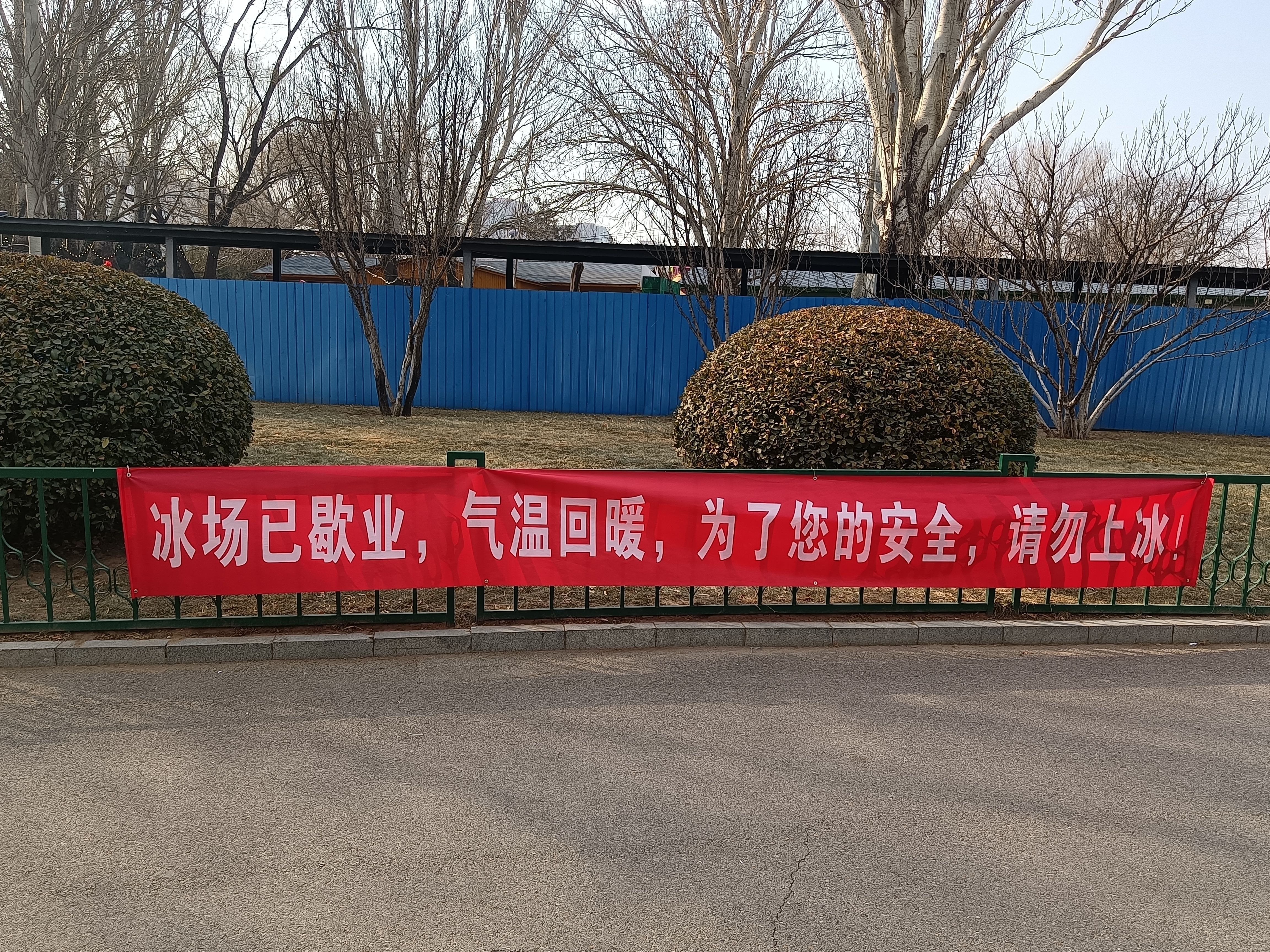 2月5日,玉渊潭公园南门贴着“请勿上冰”的横幅。新京报记者彭镜陶摄