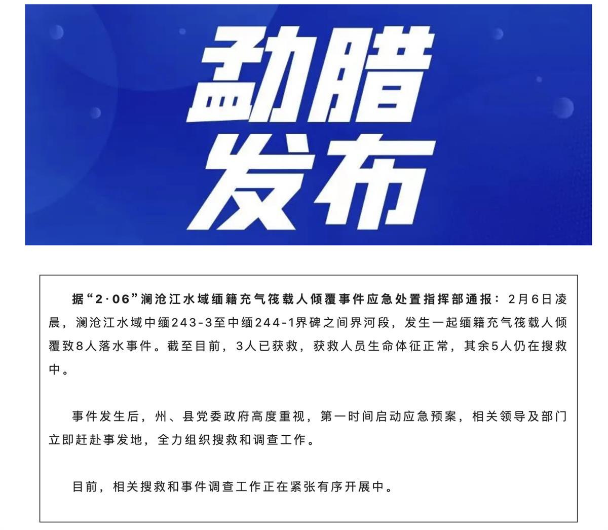 2月6日10时41分,云南省西双版纳傣族自治州勐腊县委宣传部通报,当天凌晨,澜沧江水域中缅243-3至中缅244-1界碑之间界河段,发生一起缅籍充气筏载人倾覆致8人落水事件。截至目前,3人已获救,获救人员生命体征正常,其余5人仍在搜救中。