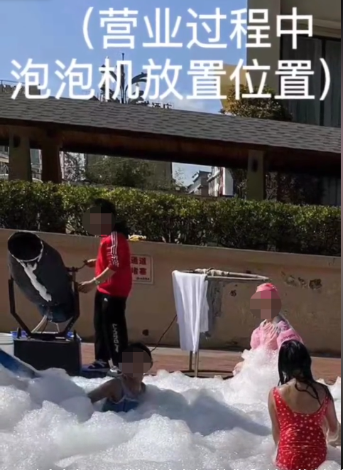 上游新闻(报料邮箱baoliaosy@163.com)记者从视频中看到,有人在九龙温泉门口进进出出。视频显示,供儿童玩耍的泡泡机摆放在泳池旁边,多名小孩在一旁嬉戏。