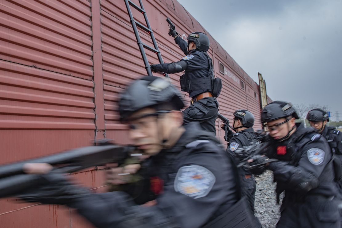 近日,上海铁路公安局南京公安处特警支队联合南京东站派出所围绕侦察、搜索、突击等课目开展实战化交通工具反劫持演练,全面锤炼多警种协同处置能力,为今后遂行多样化任务提供坚强的能力支撑。(巢恪嘉、余海洋)