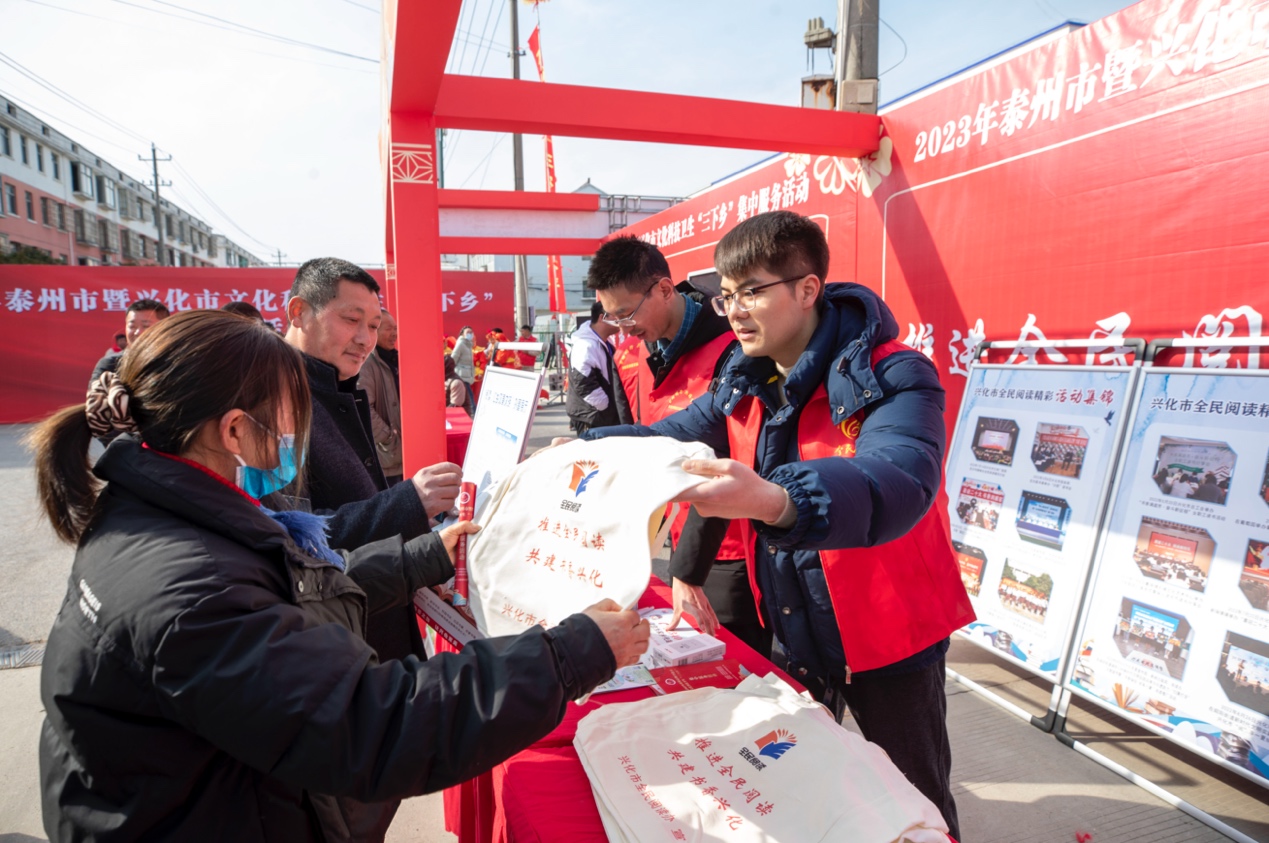 2月3日下午,兴化市全民阅读春风行动走进大营镇。在三下乡活动现场,兴化市阅读办的志愿者积极宣传全民阅读理念,以书笔为媒,为群众送上“阅读春风”。