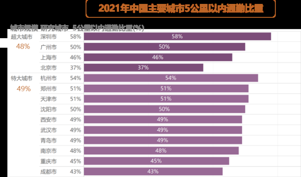 单程5公里以内的通勤,又称“幸福通勤”,其比重反映就近职住、可以慢行通勤的人口占比,是城市宜居性的重要指标。