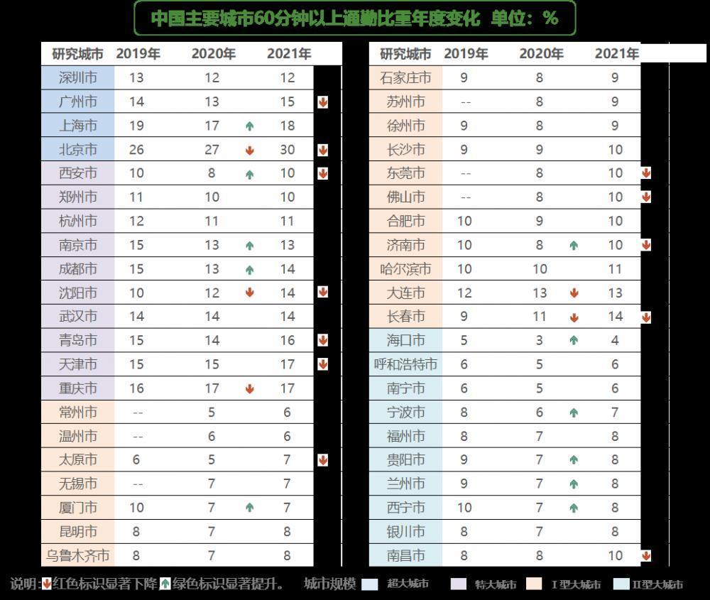 《报告》显示,2021年,各城市“幸福通勤”比重全线下降,主要城市“幸福通勤”人口比重总体平均水平为51%,同比降低2%。其中,超大城市48%,同比降低1%;特大城市49%,同比降低2%。
