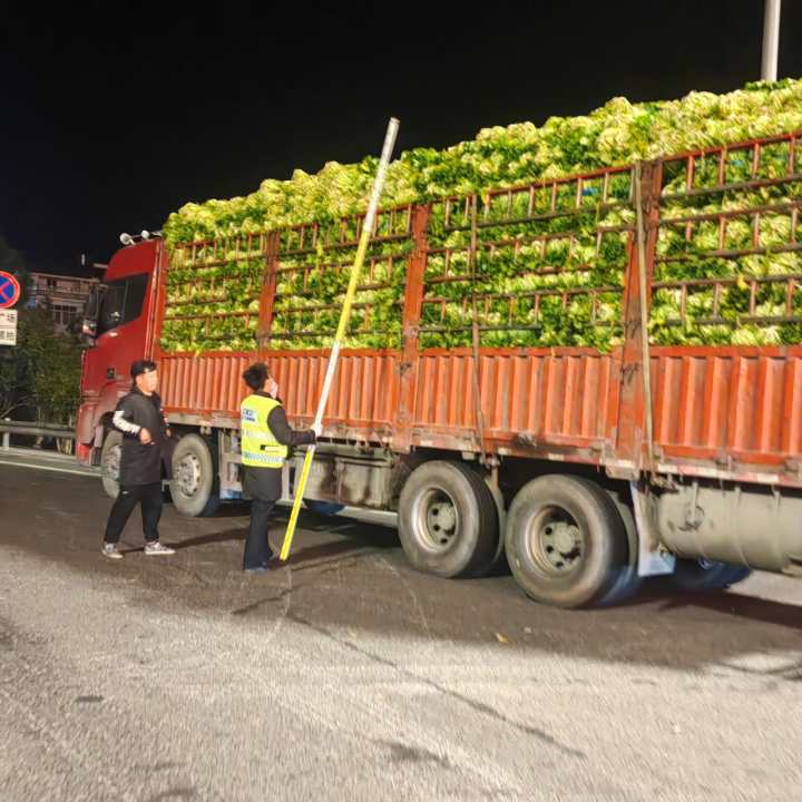 “师傅你好,怎么不盖篷布?这些蔬菜很容易抛撒出去,不仅货物损失还有可能造成道路交通事故。”