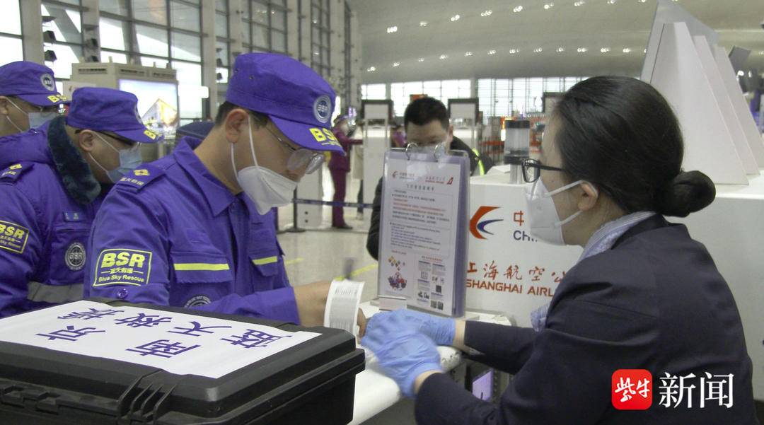 救援队员到达南京禄口机场候机楼后,东航地服工作人员将他们安排在值机主任柜台优先办理相关手续,并派专人协助完成超大行李托运等事项。