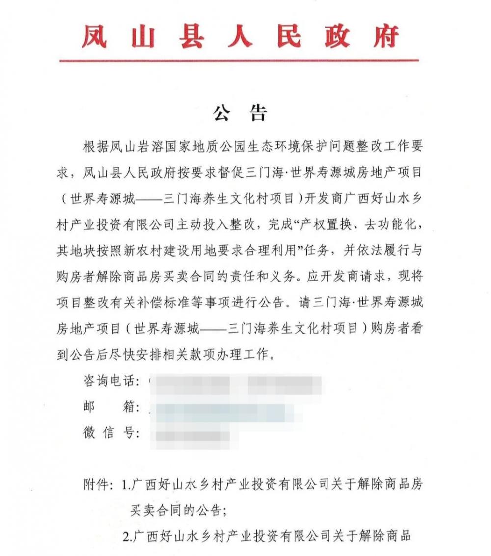 值得注意的是,截至2023年2月8日,凤山县针对寿源城项目发布的公开文件中,这一项目的相关整改工作,不少环节由开发商广西好山水乡村产业投资有限公司出面推进。对于补偿等事宜,则以广西好山水乡村产业投资有限公司的名义,规定补偿费构成为实际购房款+以2022年一年期整存整取定期存款基准利率1.5%计算的利息(各购房户以实际购房年限核算)+以购房款为基数1%的违约金。