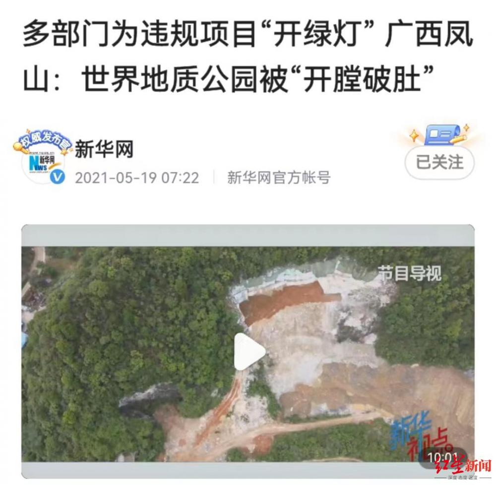 2021年4月,中央第七生态环境保护督察组在通报的督察典型案例中指出,广西壮族自治区河池市凤山世界地质公园保护为项目开发让路,造成国家级地质遗迹点和部分保护区域土地被违规审批用于矿产资源和房地产开发,问题十分突出。