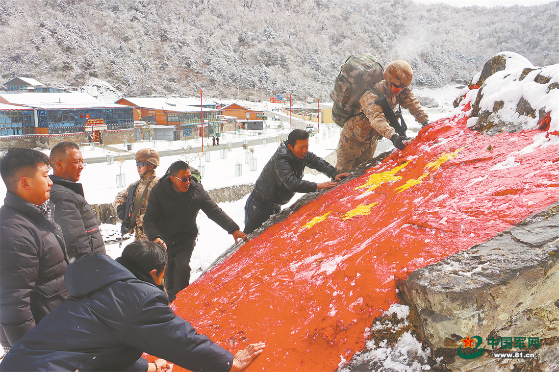 “家是玉麦,国是中国。”2017年10月,习主席给玉麦乡牧民卓嘎、央宗姐妹回信后,这句话已经成为玉麦乡的名片。今年春节过后,西藏军区某边防团官兵与玉麦乡群众联合巡边时,精心清洗擦拭描绘在山石上的国旗图案。他们用歌曲《国家》表达心声:“一玉口中国,一瓦顶成家……有了强的国,才有富的家。”