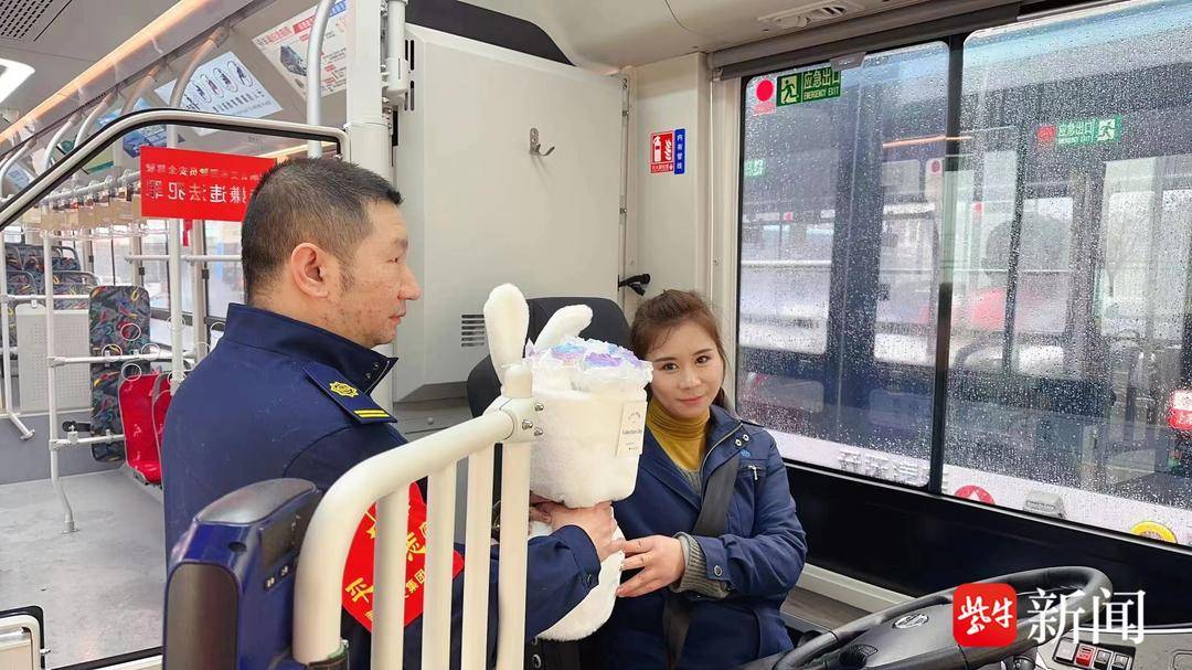 扬子晚报网讯(通讯员王轩马悦记者笪越)“老婆,你辛苦了!马上就是情人节了,祝节日快乐!”2月13日上午10时,南京公交集团第三客运分公司44路驾驶员苏桂芳驾驶车辆回到宁双路公交场站,正像往常一样进行车窗通风和车厢消毒清洁时,忽然看到丈夫张俊手捧鲜花走进车厢。苏桂芳开心地收下了老公的花,脸上洋溢着幸福的微笑。