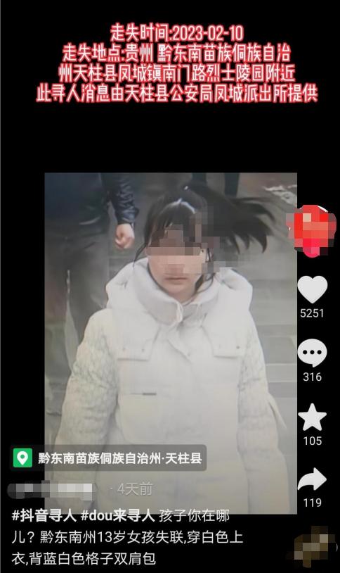 “紧急寻人,寻找贵州13岁女孩……”最近几天,有不少网友发消息称,贵州黔东南苗族侗族自治州天柱县13岁初一女生龙某钰于2月10日离家失联,至今下落不明。2月15日下午,红星新闻记者从龙某钰家属处了解到,龙某钰疑是被人带到了广东东莞,“跑出来”后给母亲打了电话。其母以及老家派出所民警已赶往东莞,准备将她接回。