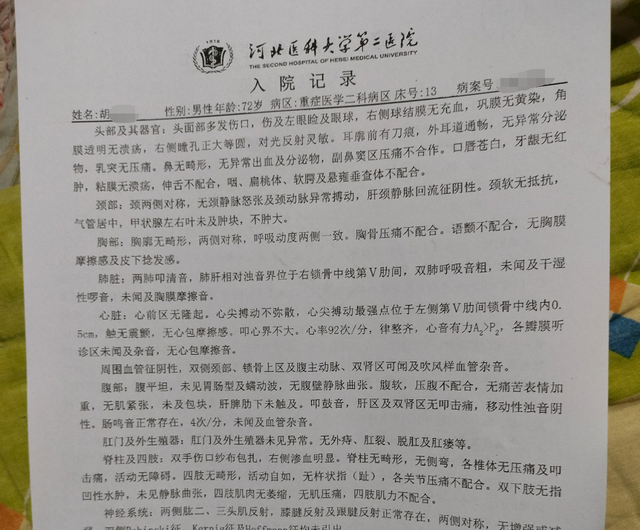 2月16日,网友胡先生告诉潇湘晨报记者,受害者是他的父亲,今年72岁,事发后家人第一时间将父亲送往医院救治,目前父亲还在河北医科大学第二医院的重症监护室内,处于昏迷状态,“大夫说有可能成为植物人,大脑已经伤了。”