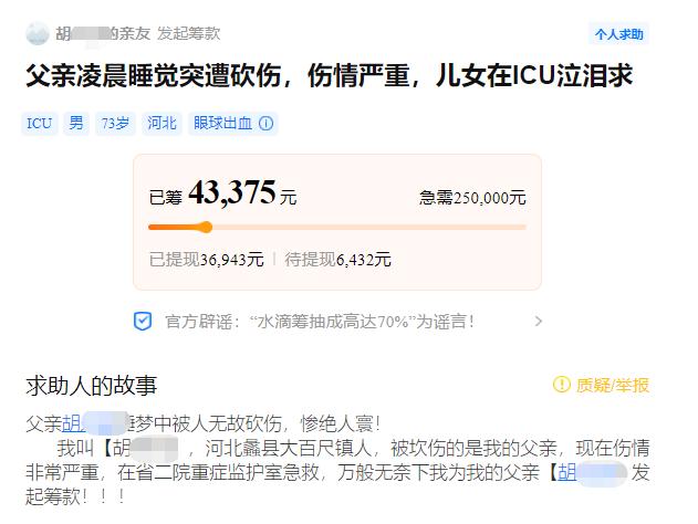 胡先生告诉潇湘晨报记者,目前警方已经介入,案件正在侦办中,父亲的治疗费用已经花去18万元左右,都是和亲戚朋友借的钱,因后续治疗费和康复费用高昂,他们无奈只能求助于水滴筹。