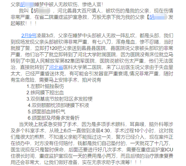 2月15日,河北保定一网友发文称,2月9日凌晨,72岁的父亲在睡梦中被人持菜刀闯入家中砍伤,目前仍在医院重症监护室接受治疗,引发关注。