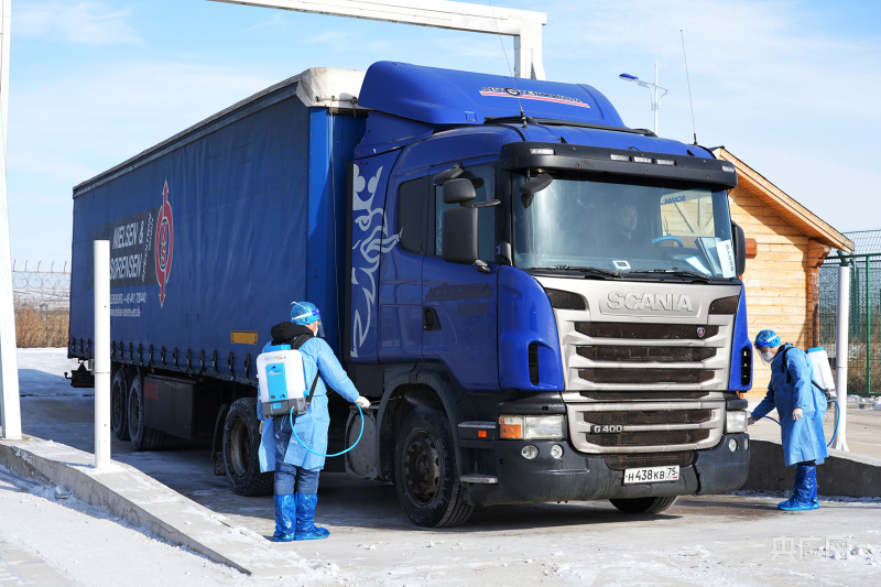 中方对俄籍入境车辆消杀(央广网发王化勇摄)