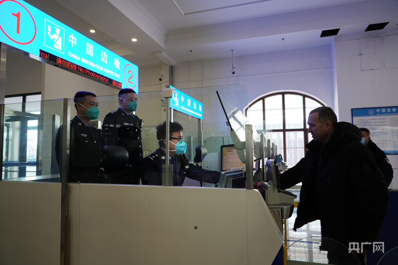 满洲里出入境边检站查验入境俄籍司机有效证件(央广网发王化勇摄)