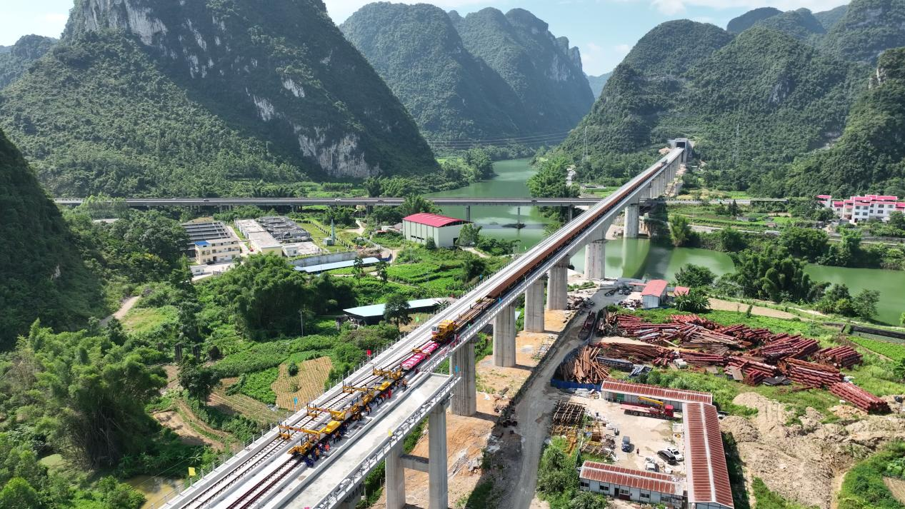 铺轨机在贵阳至南宁高速铁路龙江双线特大桥上进行铺轨作业(央广网发邢星摄)